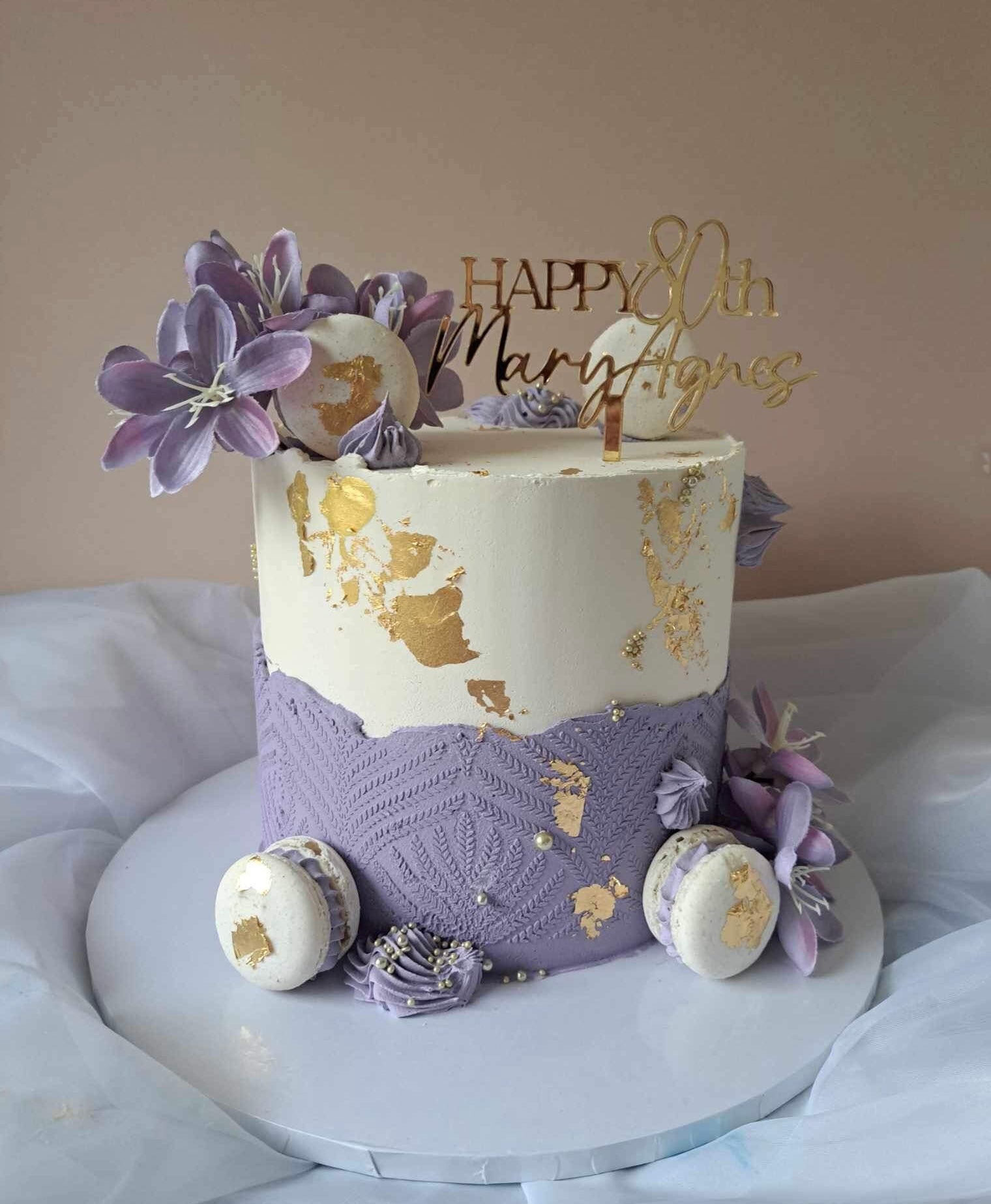 7 inch wide cake can be tailored to your celebration by adapting the topper style, for birthdays or anniversary’s etc. Shown in cream and purple colour way but can be adapted to any colour scheme. Includes macarons, bespoke topper, faux flowers and bespoke topper.