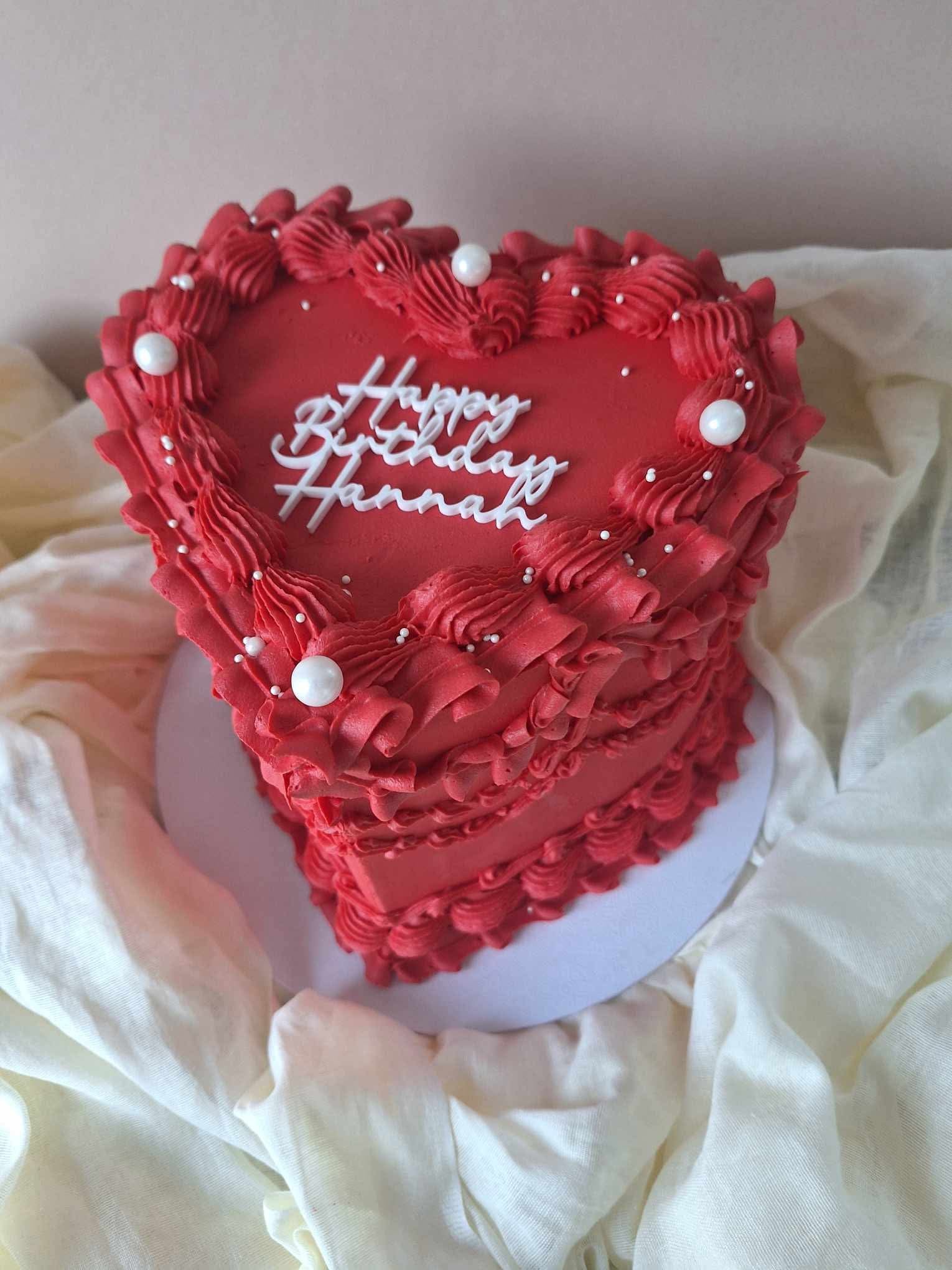 Large heart shaped cake, single colour base and vintage piping. Includes centre message.